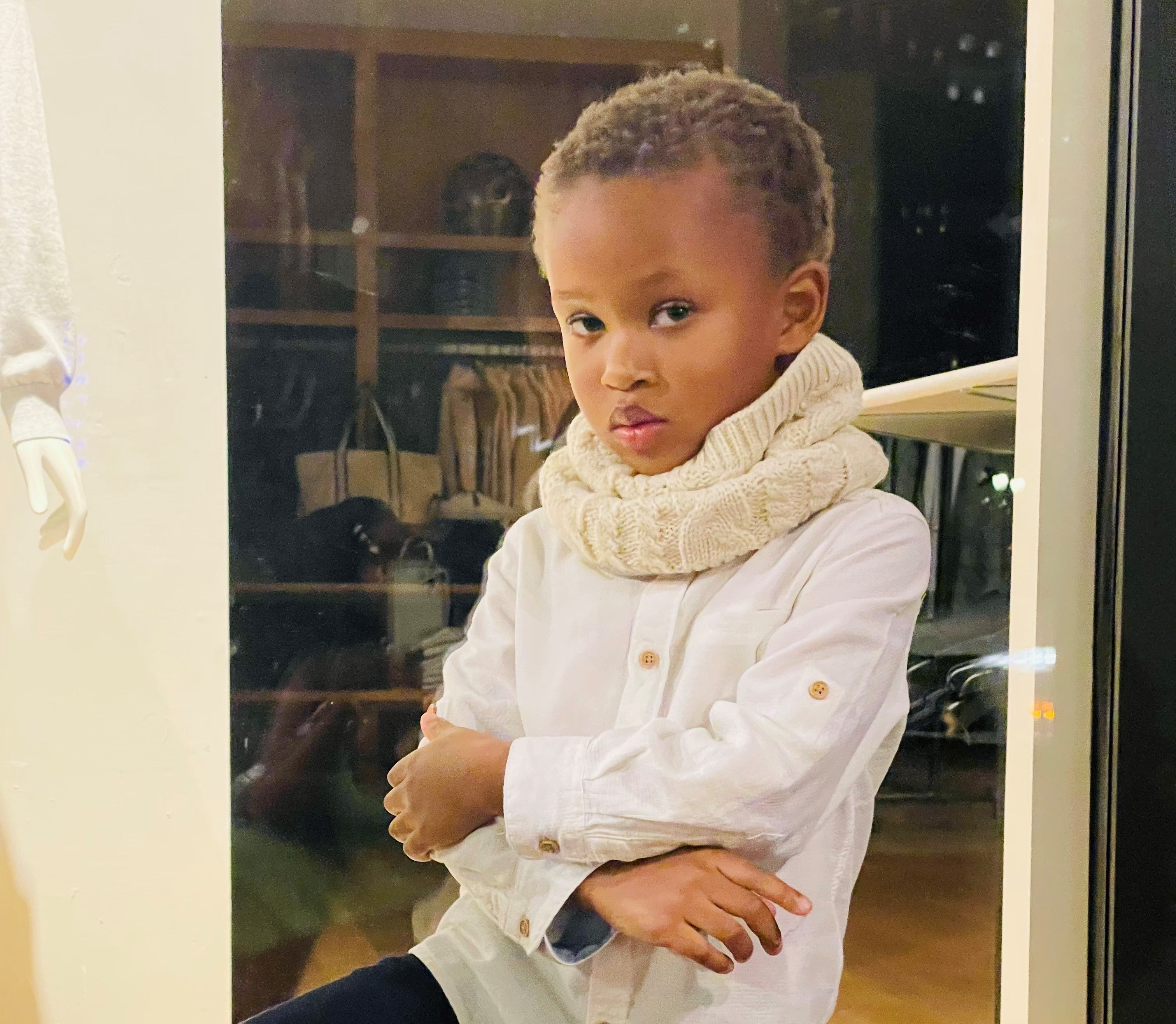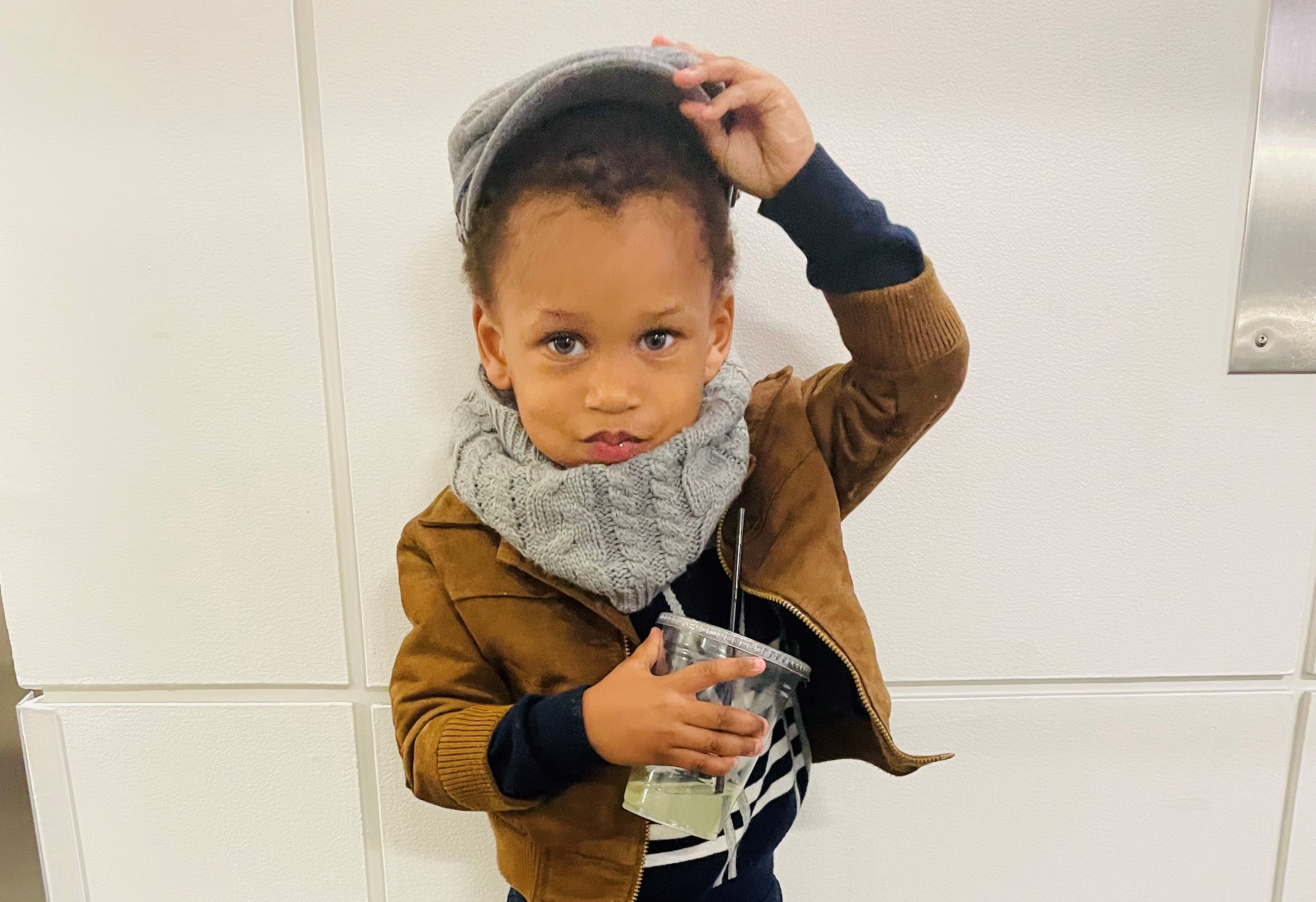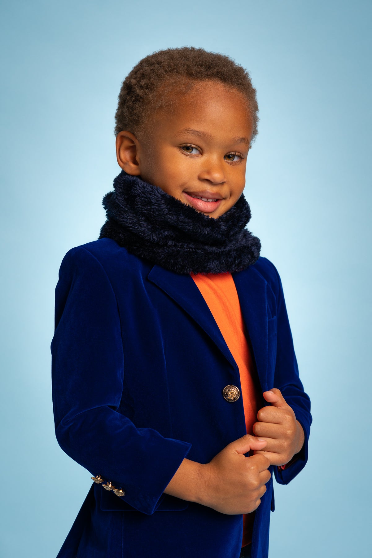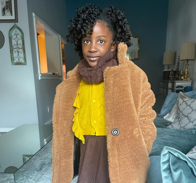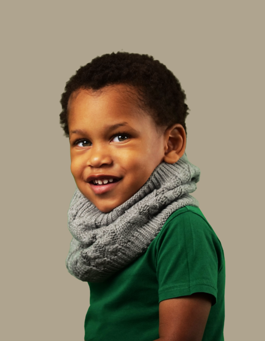 Skylar headed to school, wearing the bandeau scarf in chocolate